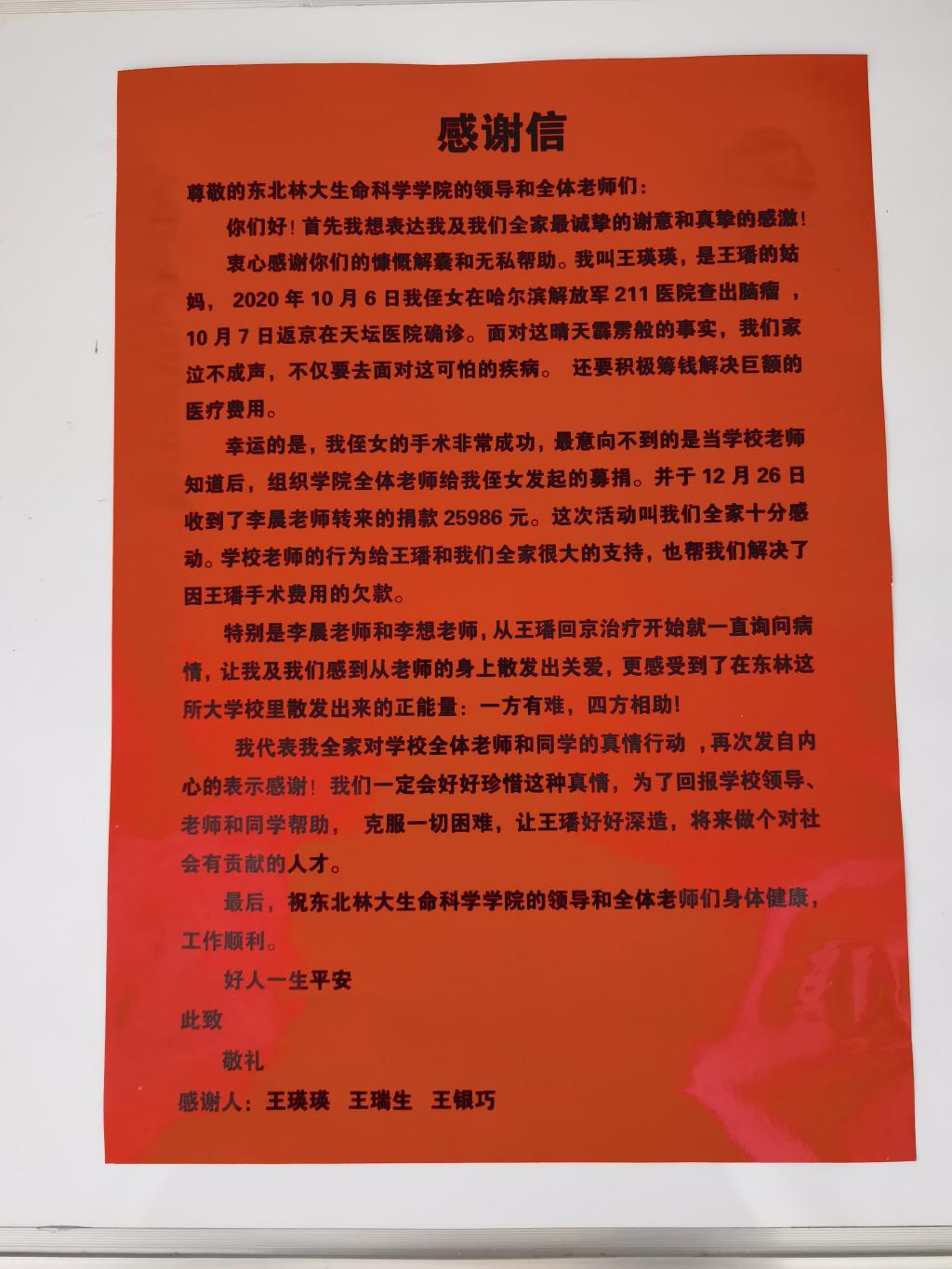 张贴在教学楼走廊里王璠家人的感谢信